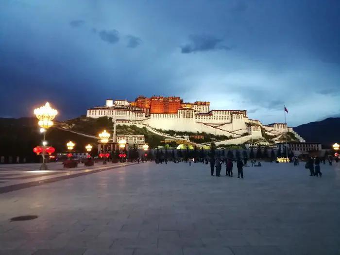 布达拉宫的夜景,是游人观赏的一个点。拍夜景的地方,至少有两处,一处是在宗角禄康公园内,借着一个水池,拍它的倒映。傍晚,池栏旁早已架起了长枪短炮;一处就是布达拉宫广场。有人在广场上倒一滩水,也是为了拍倒映。药王山观景台,也可以拍布达拉宫夜景。