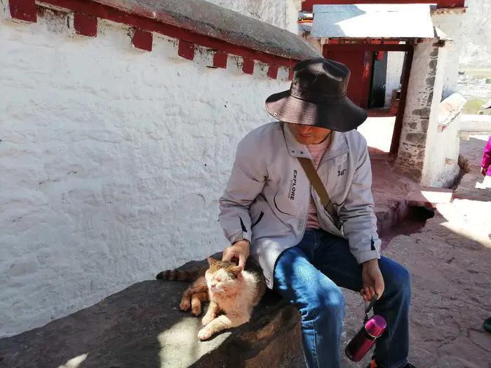 正好坐下来歇息,来逗这只猫玩。有两个十二三岁的少年也来逗它,它不时懒洋洋的翻仰个身子,把它拎起来,放在腿边的石阶上,它温驯得像是自家养的。我让那少年,帮我拍了一张与猫咪的合照。