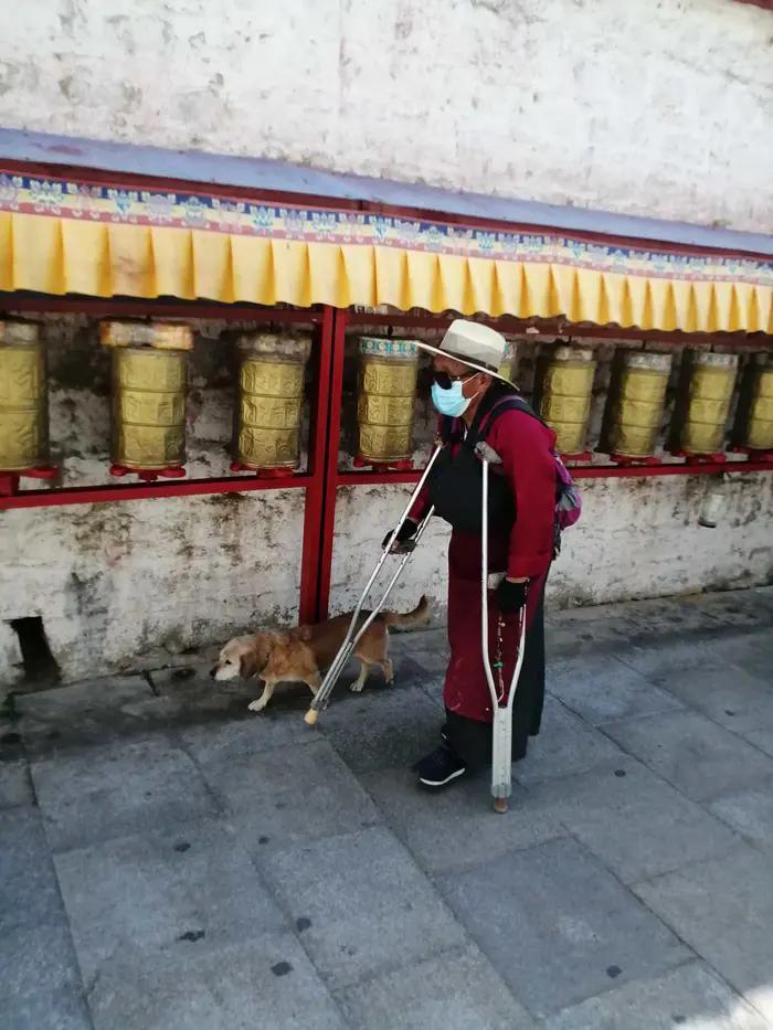 我在第二次去的时候,几乎每天都去转布达拉宫一圈。也常常在这个出口停留一下,坐在路边的石凳上,看走过的每一个人,有背着包的游客,有穿着藏袍的藏胞。看他们跟着游客身后去兜做生意,看一手转着经筒一手捻着佛珠的信徒,看磕头的人接过奉爱过来的票子,听他们念着祝福的经。