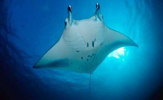 3、前口蝠鲼:暖水性中上层大型鱼类。鳃耙发达,主食浮游甲壳类,也食小型成群鱼类。体盘宽达6m余。