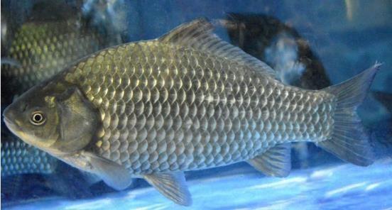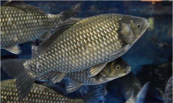 4、鲫鱼:体呈银灰色,背部颜色较深。最大个体可达4kg。适应性强,不论水深或浅、流水或静水、清或浊均有其踪迹。杂食性。