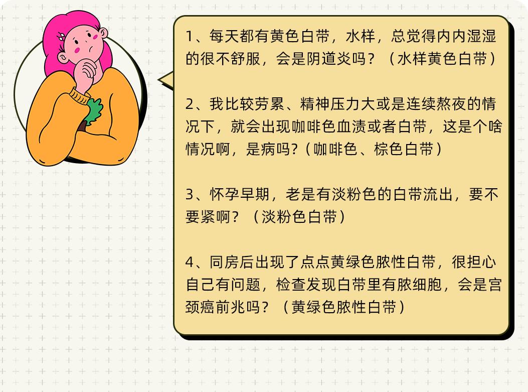 尤其是在白带颜色上,因为可以直观地发现颜色变化,所以更容易引起焦虑,就比如下面的这几种情况:
