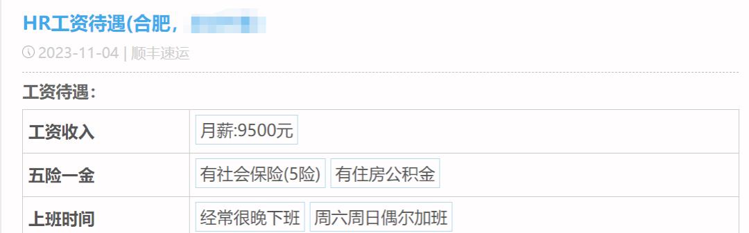 第一位自曝薪酬待遇的是顺丰的HR,他的月薪是9.5K,有五险一金,工作日经常晚下班,周末偶尔要加班