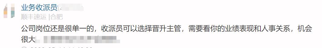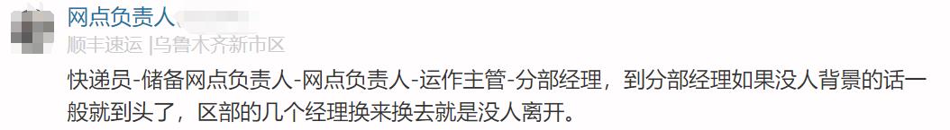 顺丰员工原话1:快递员-储备网点负责人-网点负责人-运作主管-分部经理,需要看你的业绩表现和人事关系,机会很大。到分部经理如果没人背景的话一般就到头了