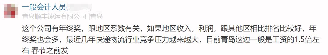 顺丰员工原话1:公司的年终奖跟地区系数有关(所以导致有些地区没年终奖),如果地区收入,利润,跟其他区相比排名比较好,年终奖也会多,最近几年快递物流行业竞争压力越来越大,目前青岛这边一般是工资的1.5倍左右 春节之前发