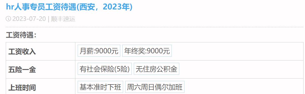 第五位自曝薪酬待遇的是顺丰的HR,他的月薪是9K,年终奖9K,有五险,工作日准时下班,周末偶尔加班