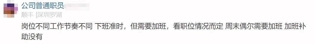 顺丰员工原话:岗位不同工作节奏不同 下班准时,但需要加班,看职位情况而定 周末偶尔需要加班 加班补助没有