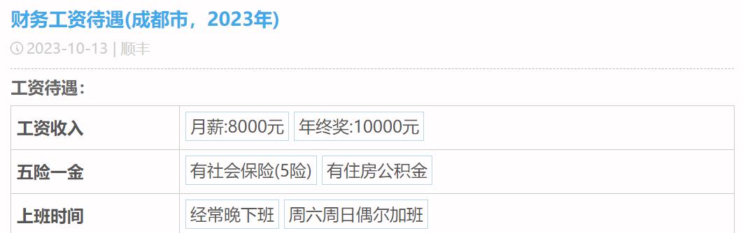 第二位自曝薪酬待遇的是顺丰的财务,他的月薪是8K,年终奖1W,有五险一金,工作日经常晚下班,周末偶尔要加班