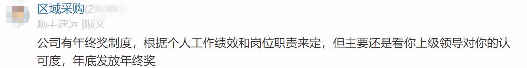 顺丰员工原话2:公司有年终奖制度,根据个人工作绩效和岗位职责来定,但主要还是看你上级领导对你的认可度,年底发放年终奖