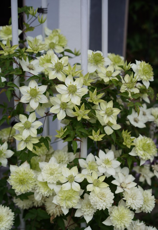 第四种,小绿。别名绿玉,可能是唯一一种喜欢背光而不喜欢向阳的铁线莲,在半阴环境下种植的,比在全阳环境下表现更好,花朵是玫瑰花瓣的,花型像个绒球一般,绿色或绿白色,非常清新的花色,看多了大红大紫,再看看它会有不一样的感觉。