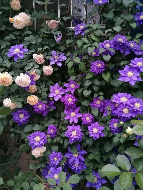 伍斯特美女,花如其名,花朵“颜值”很高,是蓝紫色系的杰出代表,花朵大中型,直径有12cm,同时开重瓣和单瓣的花朵(老枝条重瓣,新枝条单瓣),花色是深邃的梦幻紫,神秘而高雅,能营造出唯美、浪漫的意境,每年春天和秋天两度开花,第一次是4、5月份开到6月底,第二次是9月开到11月,赏花时间很可观。