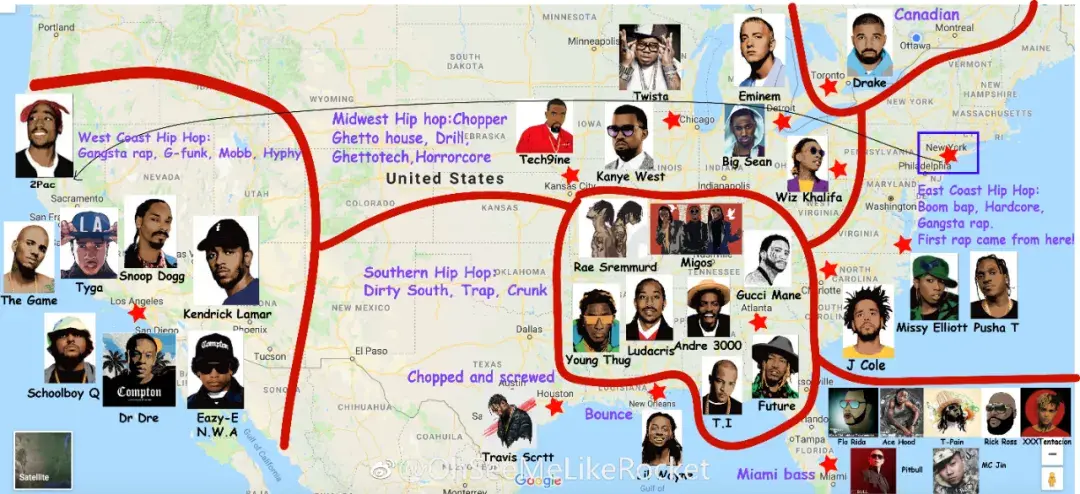 这种起源于美国街头的音乐类型,早在上世纪八九十年代,就展现出了极强的地域性,按照范围可划分为:东岸说唱、西岸说唱、南部说唱、中西部说唱、拉丁说唱等等,而通过地域衍生出的音乐风格更是多达二三十种。