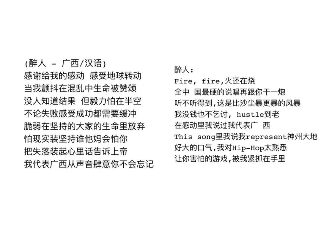 这样的歌曲还有很多很多,很多rapper都试图在歌曲中告诉大家,自己来自哪里。其实就连赵辰龙早在醉人时期就通过《南征北战》、《感动》两首歌里分别提到过自己“代表广西”。