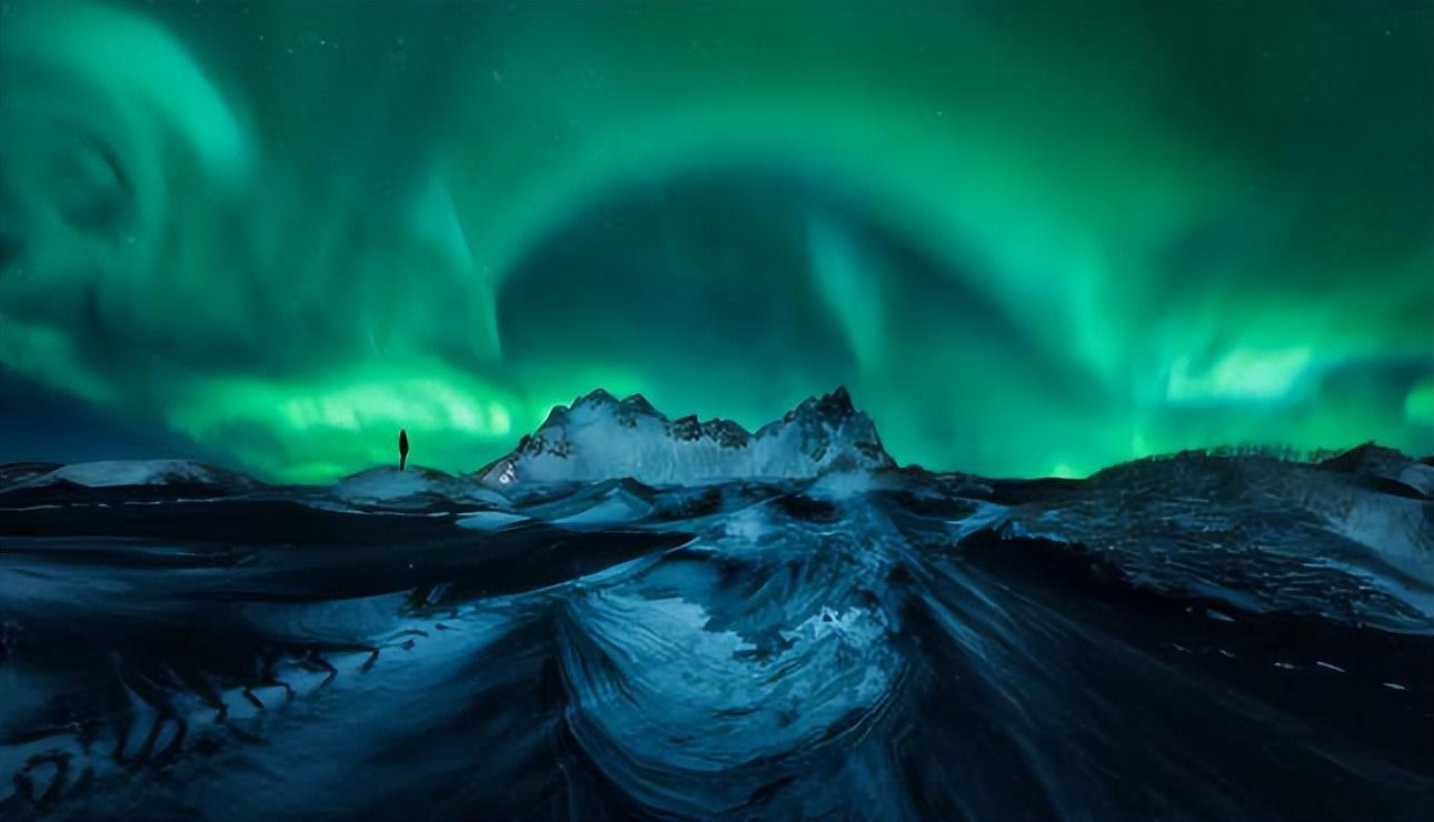 这张来自冰岛的照片捕捉到了最近在北极光下的一场降雪。极光勾勒出下方的山峰,以及在极光下映衬出一个人的轮廓。