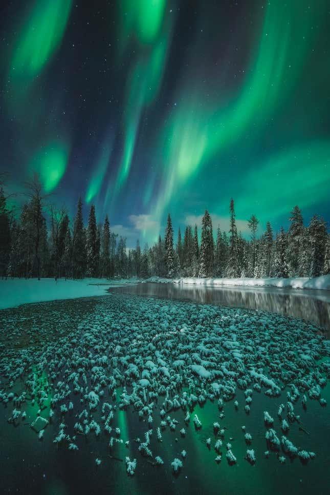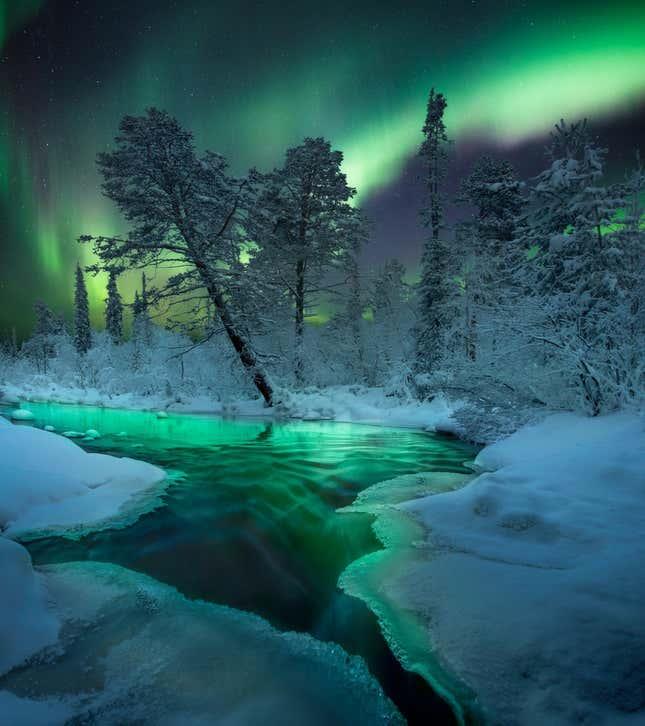在这里,一条结冰的水道位于芬兰北极光的条纹下方。考虑到可能已经目睹了这种大气灯光秀的数千代人,这种空灵的场景感觉是永恒的。