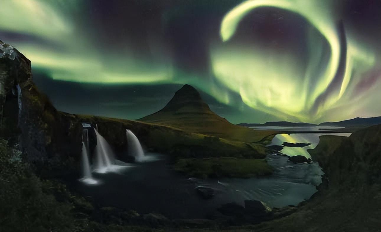一座大山突出在北极光的翡翠挂毯前。下面,一条瀑布落入一个漆黑的水池。