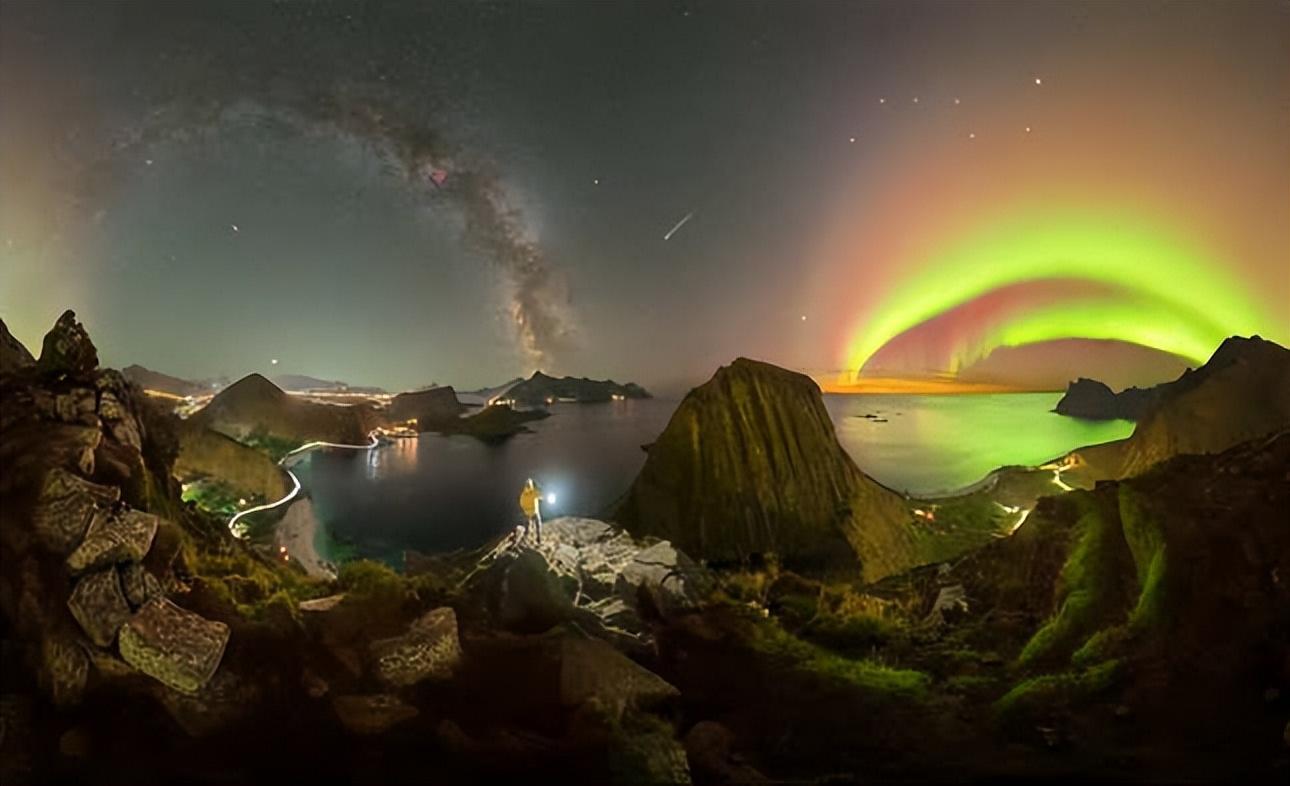 在这张激动人心的照片中发生了很多事情。三个弧线照亮了这里的天空:两个属于北极光,一个属于银河系。在银河系的弧线下方是一个光点——仙女座星系。极光和银河之间是一颗流星,极光之上是北斗七星。挪威的山峰点缀在照片的底部。