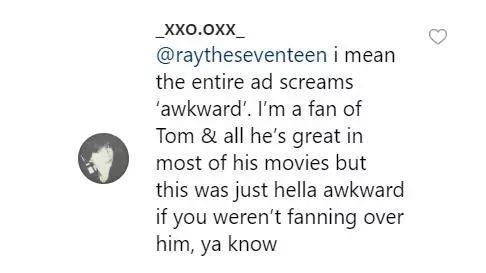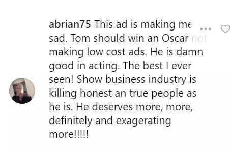 这段广告让我感到伤心,汤姆应该去赢得奥斯卡,而不是拍一些低成本广告。他演技真的很好,是我见过最好的。看看吧,商业正在“杀死”如他一样真诚的人,他现在应该获得更多。