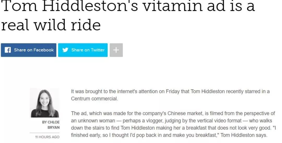 近日,雷神洛基扮演者汤姆·希德勒斯顿(Tom Hiddleston),中国网友称之为“抖森”,为某中国保健品牌拍了一条只有一分钟的短视频广告。