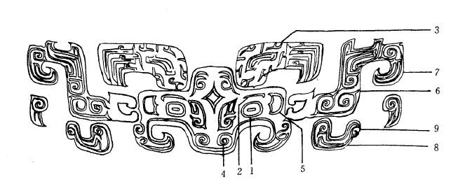 经典饕餮纹样式 1.目 2.眉 3.角 4.鼻 5.耳 6躯 7.尾 8.腿 9.足