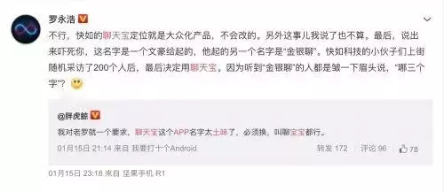 “这事儿我说了也不算。说出来吓死你,这名字是一个文豪给起的,他起的另一个名字是“金银聊”。快如科技的小伙子们上街随机采访了200个人后,最后决定用聊天宝。”