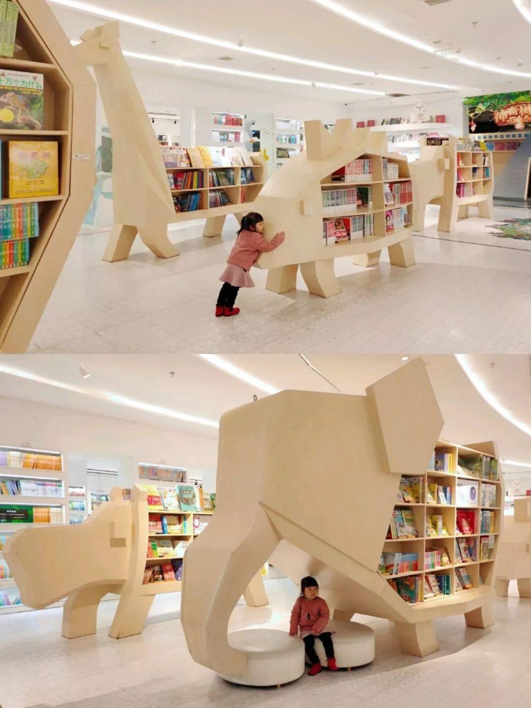 所有的书架全是动物造型:长颈鹿,斑马,大象,刺猬,狐狸,河马,牦牛…这里的藏书主要是针对6-12岁的儿童科普。旁边还有分美术区、手工区、实验区和探索区。大象形状的书架超级可爱有没有,而且大象鼻子下面的区域就还设计成了座椅,坐在这里看书一定心情很愉快呢。