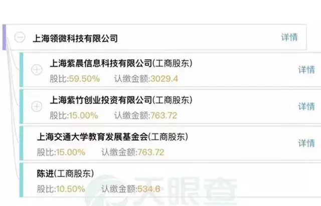 十几年前的“上海交大汉芯科技有限公司”在“汉芯造假”事件爆发之后并非停止运营,后来公司名称变更为“上海领微科技有限公司”。陈进是该公司的自然股东和董事,拥有10.50%的股权,认缴出资534.6万元,也是最大的个人股东。