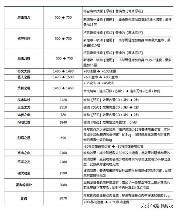 野刀体系价格统一上涨,“惩击”替换为“寒冰惩击”,新增buff叠加被动;巫术法杖、三圣之力、光辉之剑被动内置cd下调;护甲鞋、寒冰之心、不详之兆、破灭君主被动效果统一调至对建筑物不生效;修复影刃bug。
