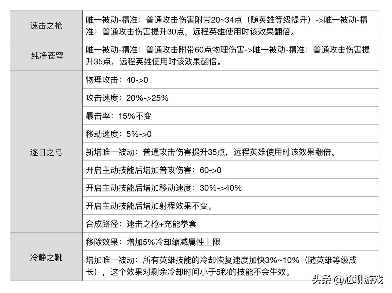 “精准”系被动由“普通攻击附带额外伤害”改为“直接增加普通攻击伤害”;逐日之弓重做,新增普通攻击伤害提升被动;cd鞋子移除增加5%冷却上限的效果(貂蝉再次跌下神坛)。