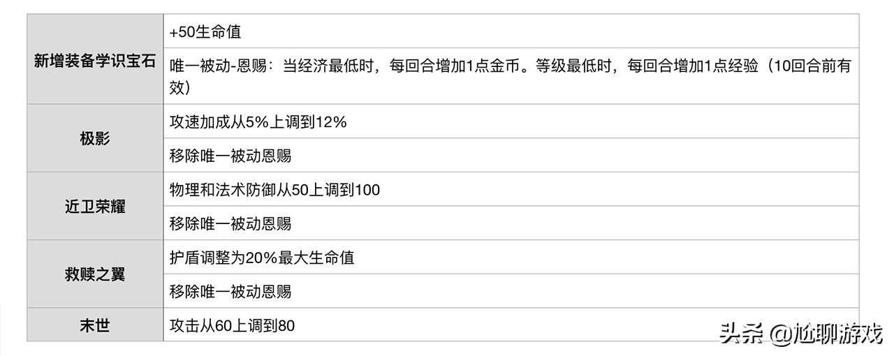 新增装备学识宝石,部分辅助装被动“恩赐”移除,末世攻击上调。