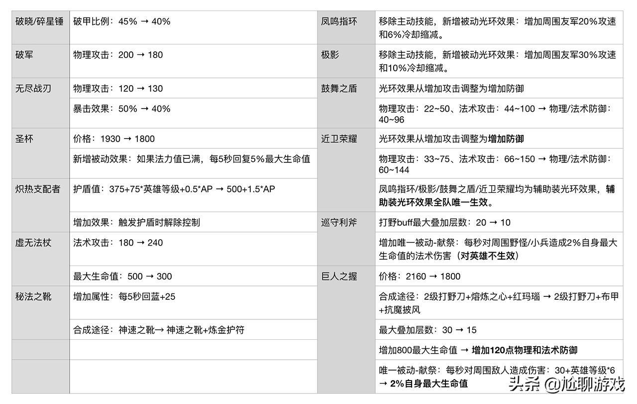 主流物理装无尽、破晓/碎星锤、破军调整;法系冷门装圣杯、炽热支配者、虚无法杖、秘法之靴调整;打野肉刀体系调整;辅助装备调整。