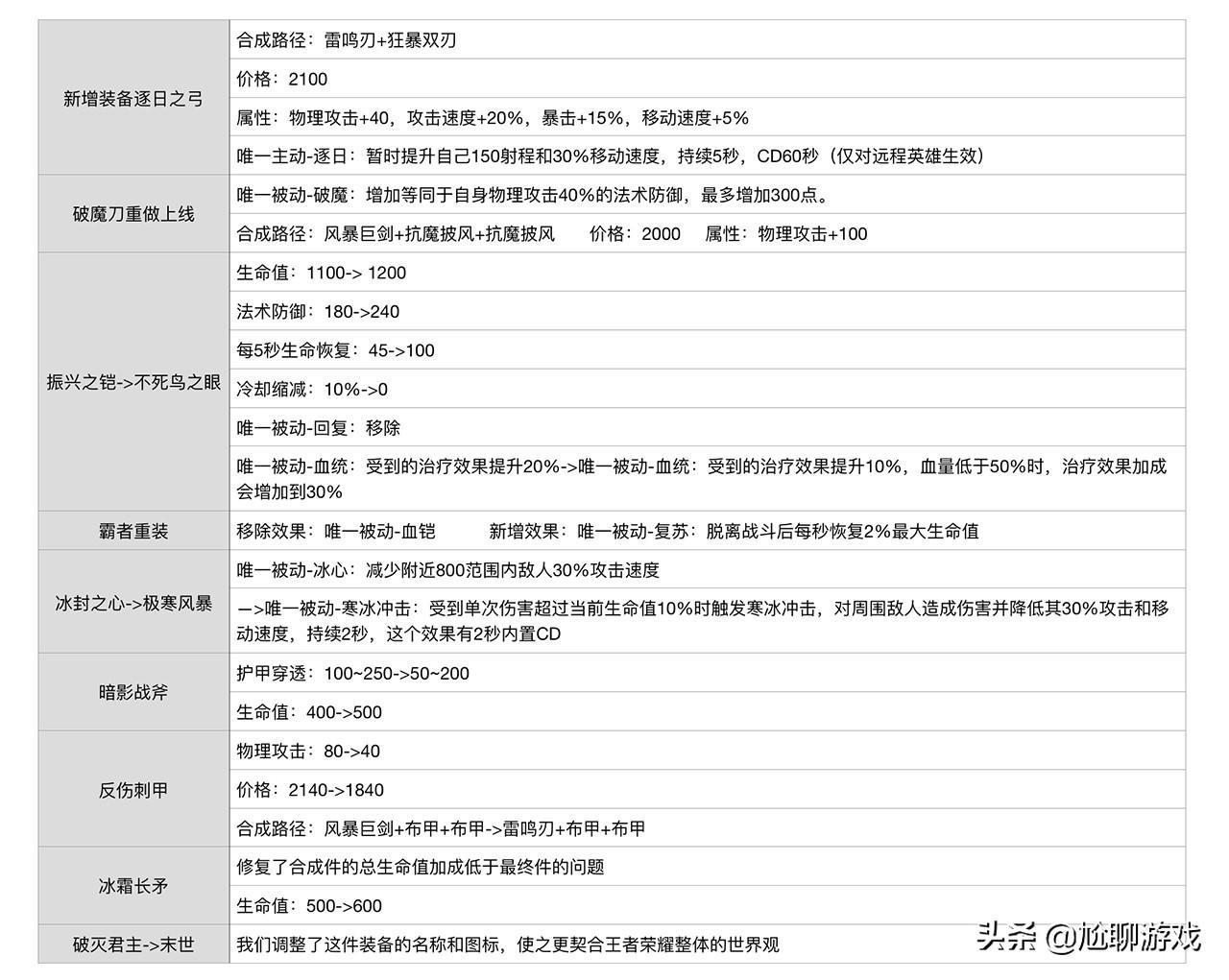 新增装备逐日之弓;破魔刀重做;振兴之铠替换为不死鸟之眼;冰封之心更名为极寒风暴;暗影战斧、反伤刺甲调整;破灭君主更名为末世。