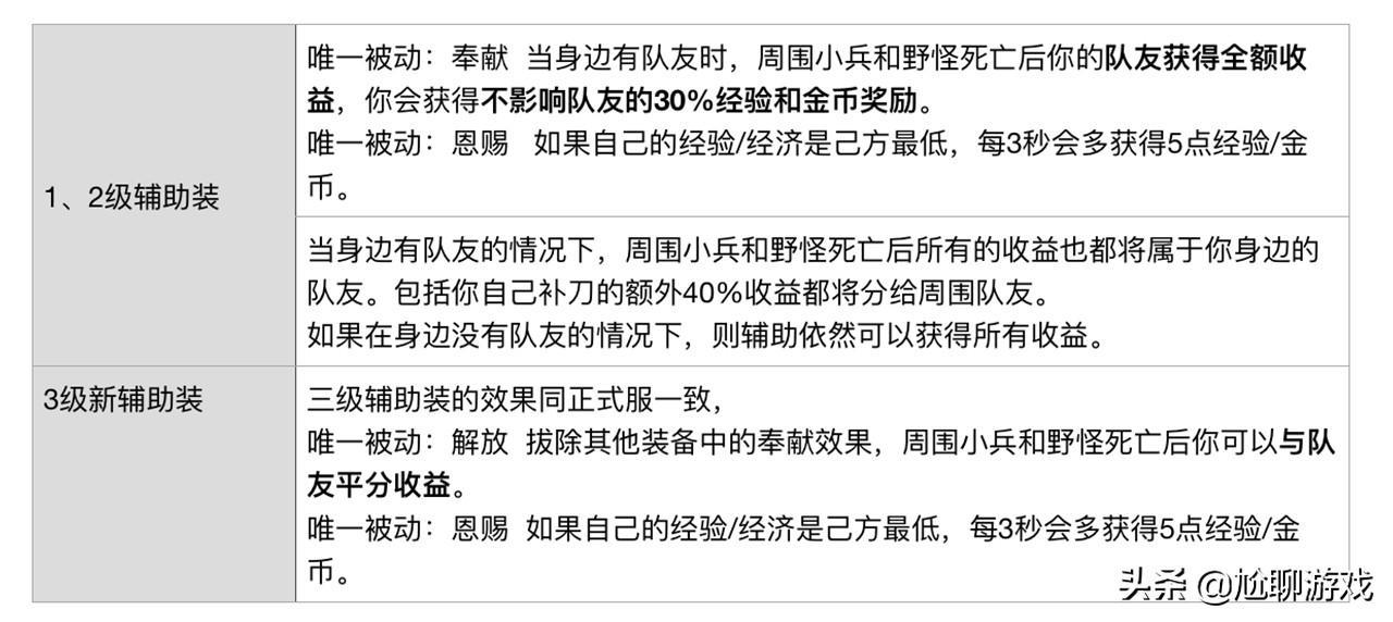 将近卫荣耀和奔狼纹章由防御装划入辅助装体系;所有的辅助装备都会拥有一个全新的被动效果:如果自己的经验或经济是己方最低,每3秒会额外获得5点经验或金币;所有辅助装备的基础属性统一调整为:移动速度+生命值。