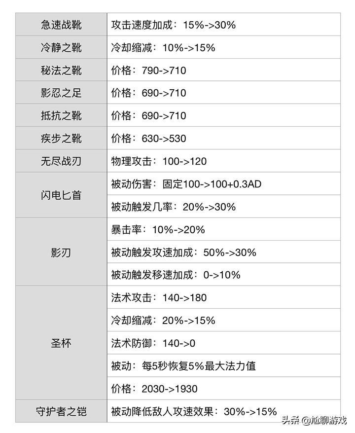 鞋类装备整体调整;电刀、无尽、影刃大幅增强;圣杯属性优化。