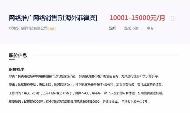 招聘海外网络游戏客服人员,并宣称包签证费、机票,0费用上岗,许以每年十几万的高薪、每餐8菜1汤、宿舍有菲佣打扫……