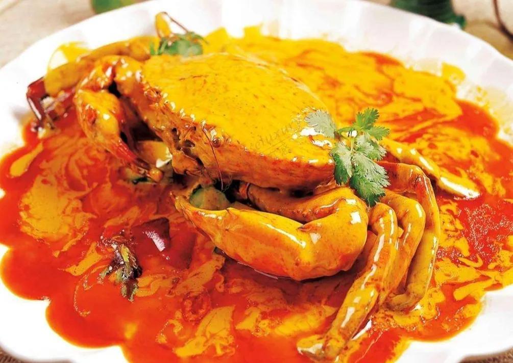 (5)把螃蟹倒入咖喱汁中翻炒,加入适量的牛奶盐和鱼露收汁。