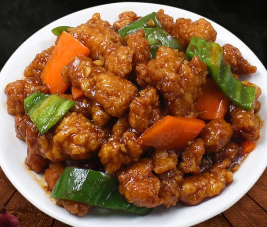 (4)锅中热油放入腌制好的里脊肉,炸至变色捞出控油,油温升高再放入里脊肉复炸一次,至表面金黄捞出。