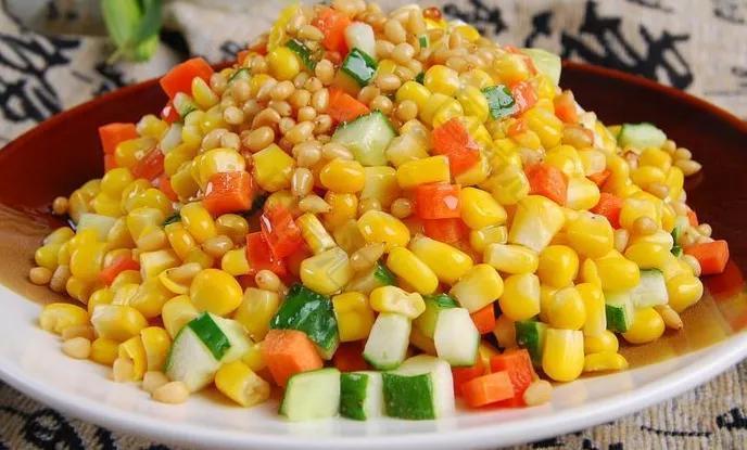 (1)青红椒和黄瓜洗净切丁,锅中热油放入黄瓜青椒丁和玉米粒一起翻炒片刻。