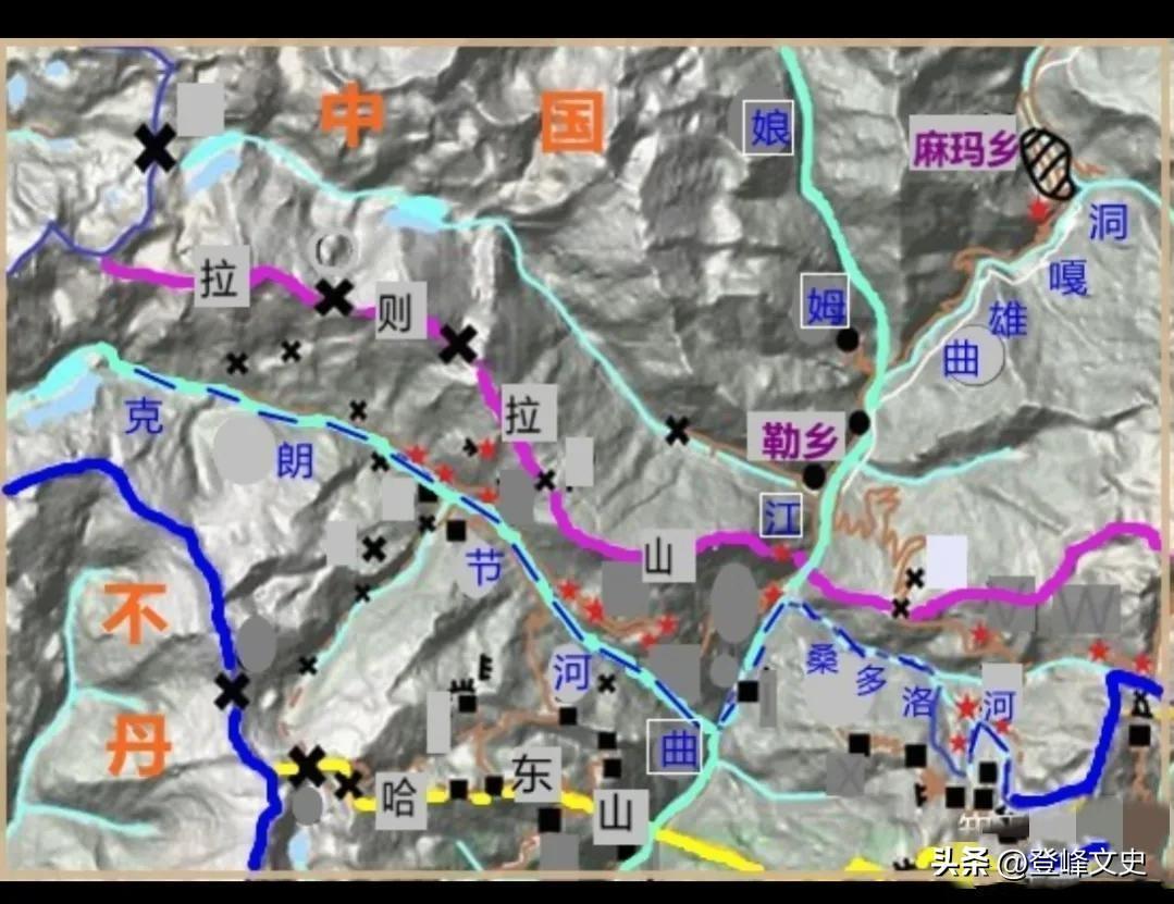 我军只得于 1987 年 4 月重返克节朗河谷,在克节朗河北岸设立了拉丁拉、日廷布、克乃宁、踏瓜登、杜让尚、汪登等6个边防点,控制了克节朗河以北地区,见下图。图中黄线表示麦线所在位置,即印度篡改前的麦线;粉色线表示印度主张的麦线位置,即印度篡改后的麦线。