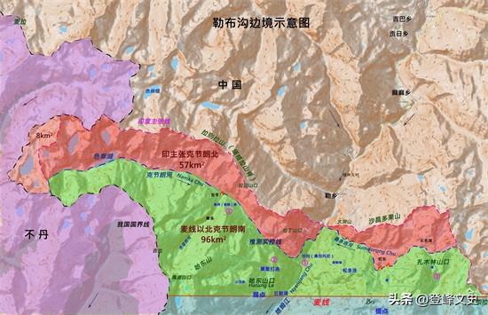 错那县东南部。有一条峡谷叫勒布沟,它是喜马拉雅山东段的一条南伸式大峡谷,西方是不丹王国,南方是门隅核心的达旺地区,从高寒的世界屋脊陡降到亚热带湿润地区,犹如小墨脱。流经勒布沟的河流叫娘江曲,最终汇入达旺河。娘江曲流过我方控制最南端的勒门巴乡约五公里,右侧汇入一条支流叫克节朗河,左侧支流叫桑多河,两条支流所在的河谷就是中印对峙的最前沿。而两个河谷完全位于非法的“麦线”以北(见下图)),印度宣称两地为其领土。