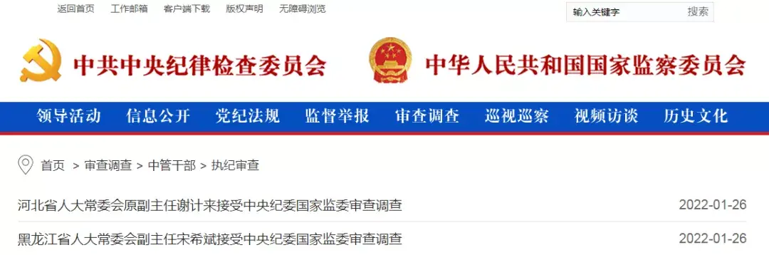 黑龙江省人大常委会副主任宋希斌涉嫌严重违纪违法,目前正接受中央纪委国家监委纪律审查和监察调查。河北省人大常委会原副主任谢计来涉嫌严重违纪违法,目前正接受中央纪委国家监委纪律审查和监察调查。