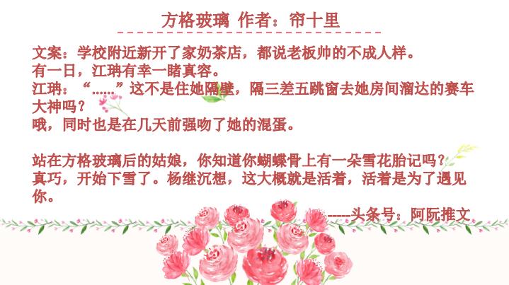 今天推荐的都是现言,其实有一本很火的现言阿阮看过,我看很多人推荐过,但是阿阮觉得一般,就是帘十里新完结的文《方格玻璃》。这本书讲的是痞子和软妹子的故事。剧情实在是有点狗血。