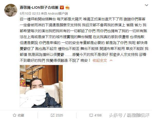 6月9号,萧敬腾在上海举办演唱会,果然不出意料当天还是会下雨,前期萧敬腾官方微博也发布了消息希望大家到时自带雨伞,避免降雨带来的不便。不过万万没想到,即使做好万全准备,萧敬腾的演出还是遇到了小意外。