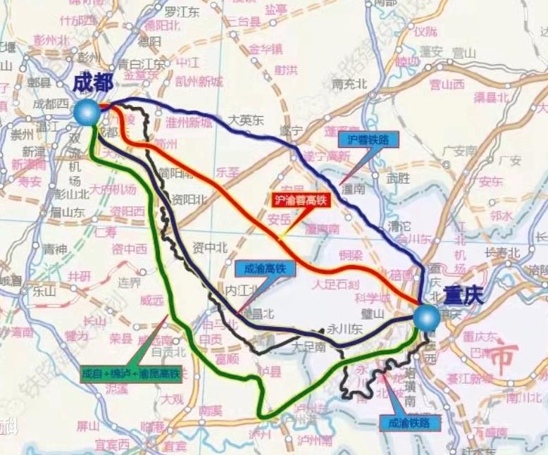当前连接成都和重庆有时速80km/h的老成渝铁路,还有扩能后时速达到200km/h成遂渝快铁以及2015年开通的时速达到300km/h的成渝高铁。我们也知道,上面这三条线,都不算是直线,甚至还觉得有点绕,而且在这成遂渝快铁和成渝高铁之间,还存在铁路空白区。我觉得建设成渝中线很有必要。