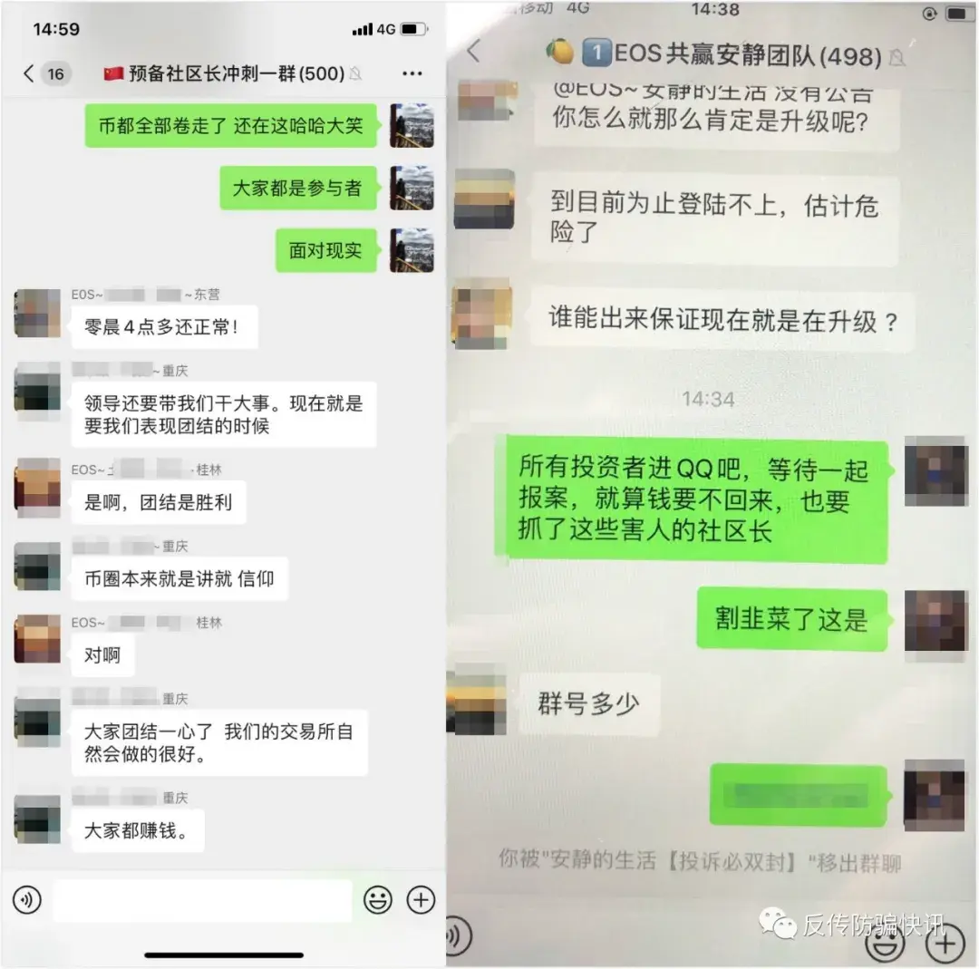 目前,“eos生态”平台的投资者已经建立了多个维权群。在维权群中,有的还保持观望态度,有的已经选择要去报案。