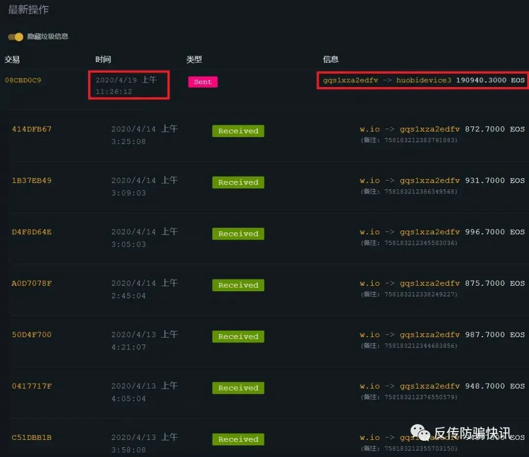 反传防骗快讯通过追踪、梳理36个账户的交易记录发现,转出的3万余枚柚子币最终都流入到名称为“huobidevice3”的账户中。