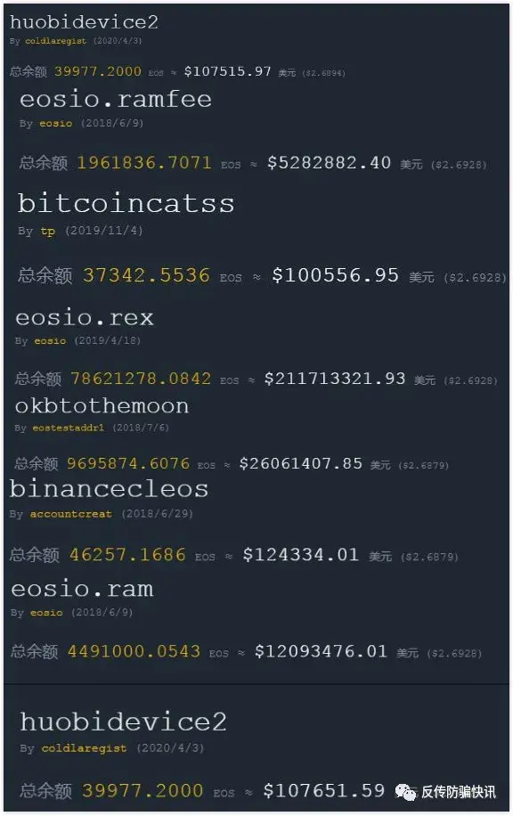 其中,“eosio.ramfee”账户中有196万余枚,“eosio.ram”账户中有499万余枚,“huobidevice2”的账户中有近4万枚,“eosio.rex”账户中有7862万余枚,“bitcoincatss”账户中有近4万枚,okbtothemoon账户中有969万余枚,“binancecleos”账户中有4万余枚,zbeoscharge1账户中有261万余枚,“gateiowallet”账户中有548万余枚。