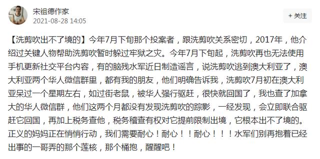 在网友们组成的声讨大军当中,宋祖德无疑是非常有知名度的一位人物。而就连宋祖德也一直在表示,林生斌是肯定有问题的。并且宋祖德在前几天还表示过,林生斌7月初的时候在澳大利亚待过一星期左右。