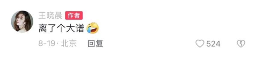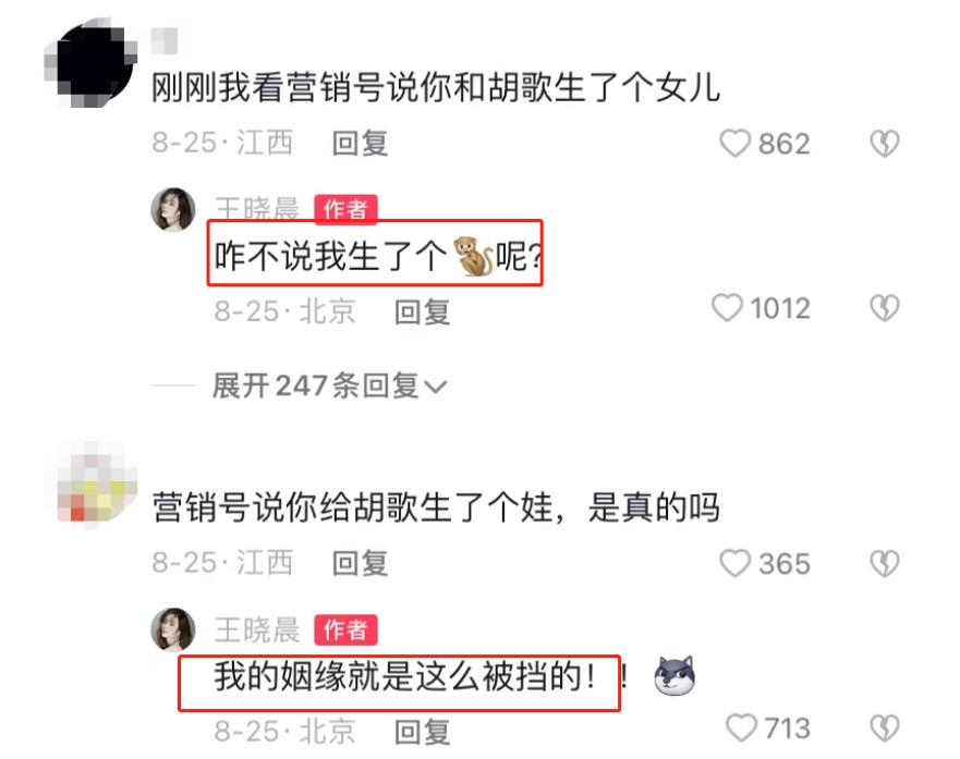 王晓晨似乎并不想理会这些传言,但这些传言却逐渐发酵、闹得沸沸扬扬,甚至有不少人跑到王晓晨评论区下方留言问她是不是真的和胡歌有个女儿,王晓晨本人很无奈地回应道“离了个大谱”“咋不说我生了个猴子呢?”“我的姻缘就是这么被挡的!”