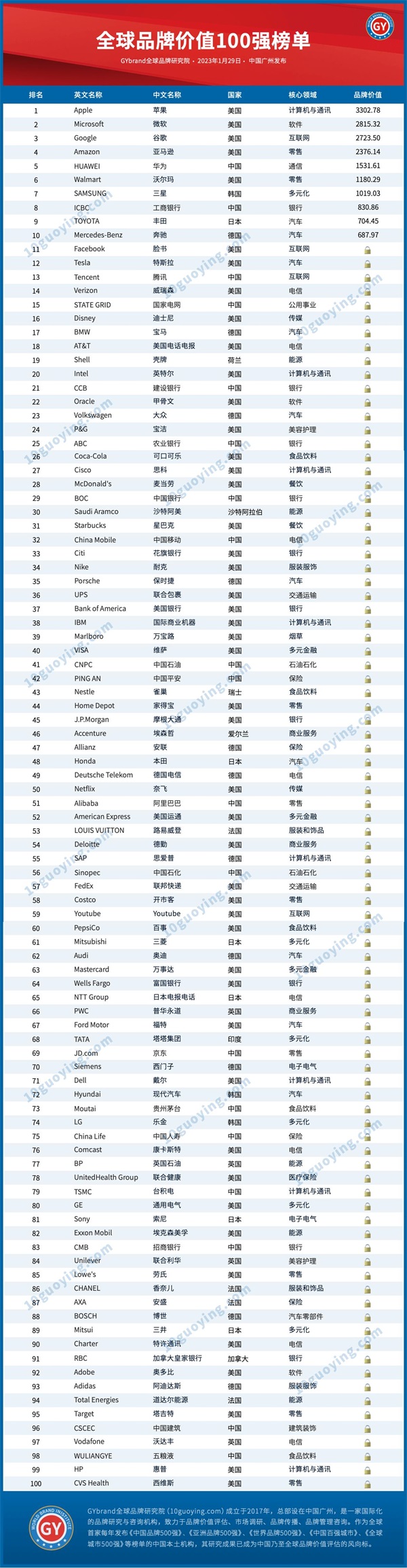 1月29日,由品牌价值评估机构“GYbrand全球品牌研究院”独家编制的2023全球最具价值品牌100强发布。